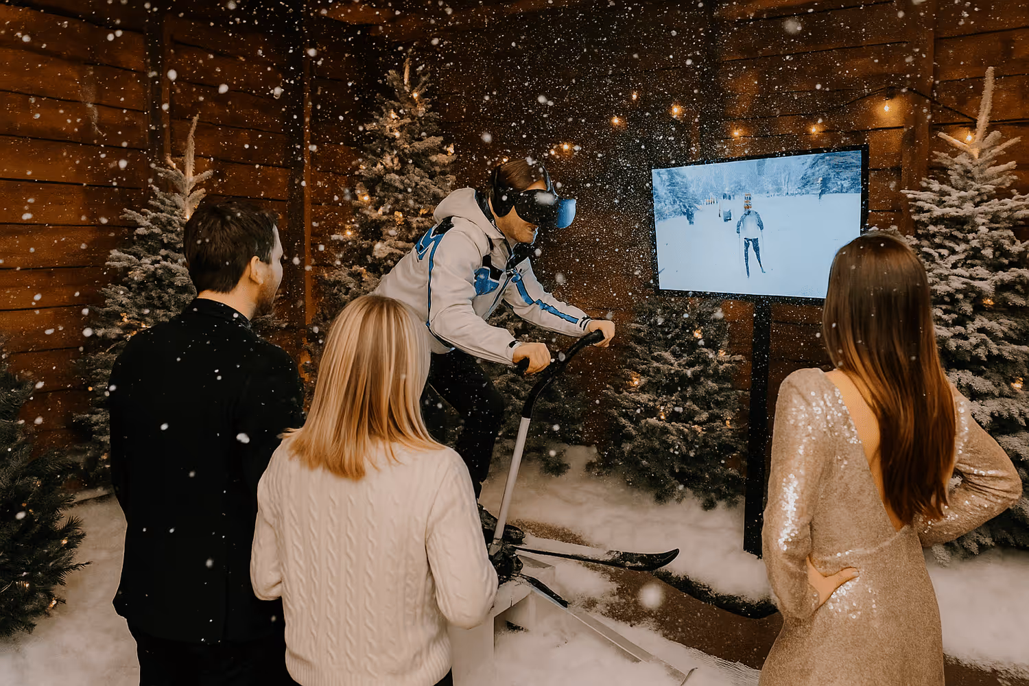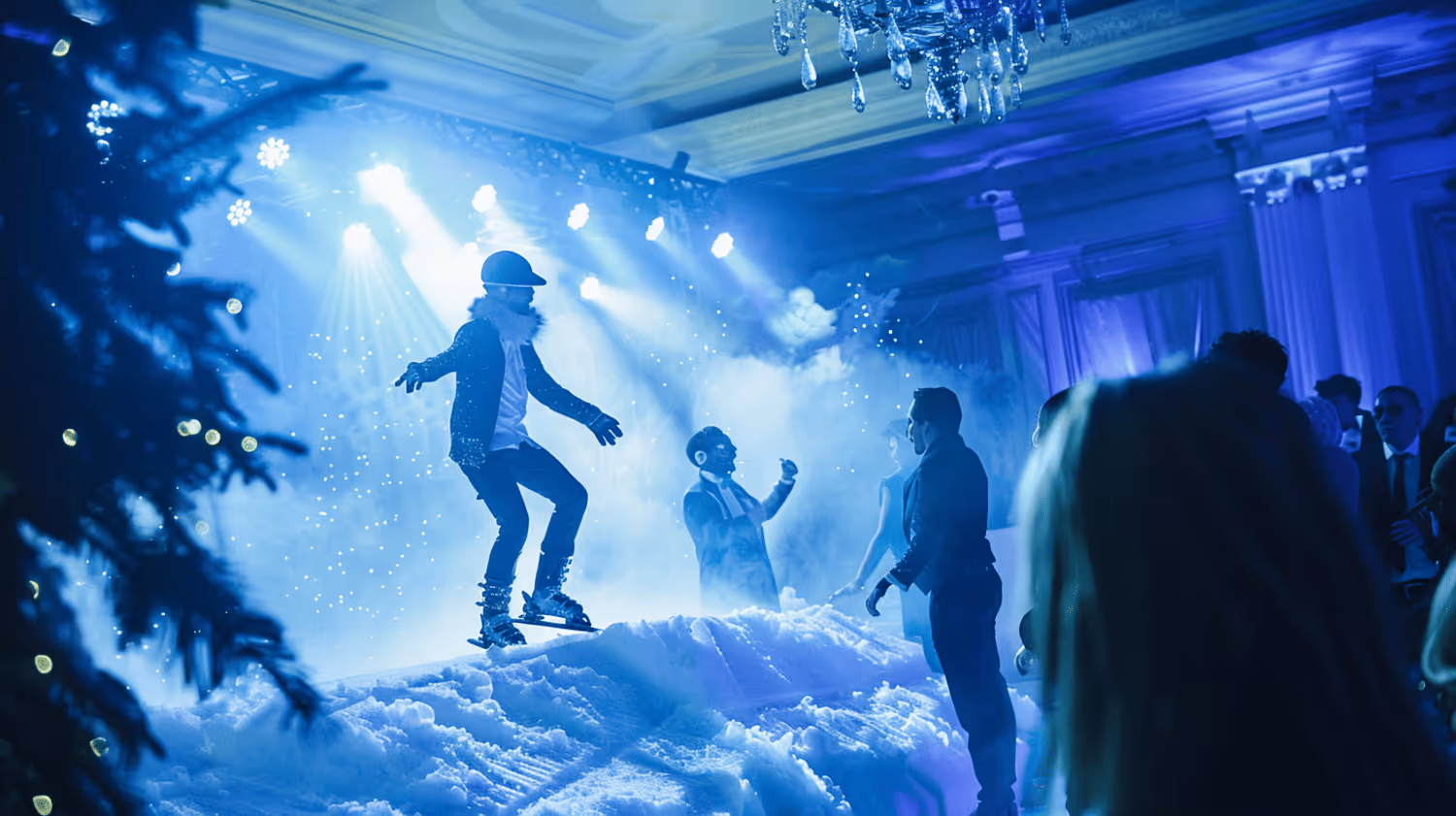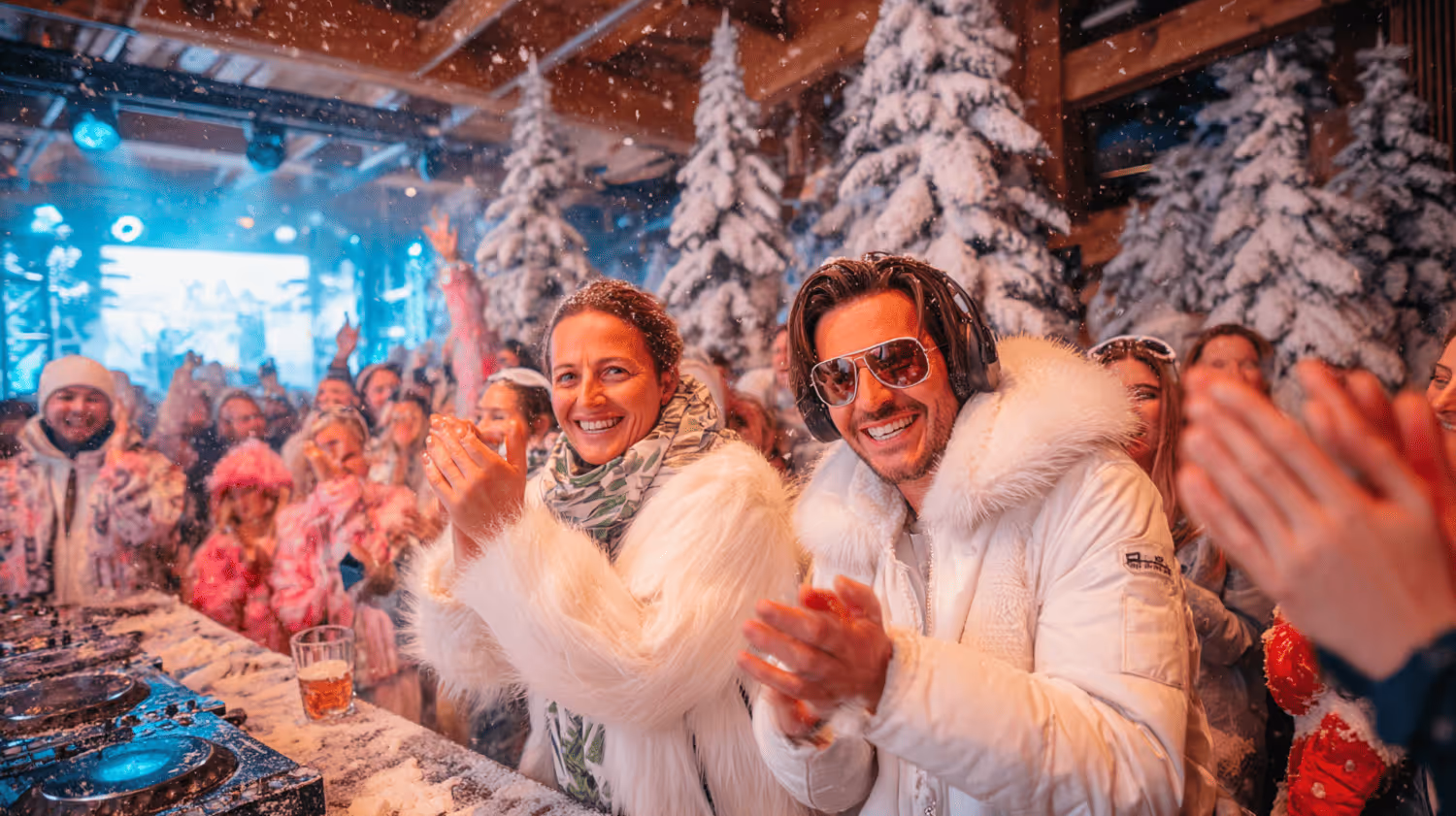Vous voici projetés dans une soirée hype « after-ski » : sapins, télésiège, neige qui tombe sur les épaules. Le DJ envoie ses premières notes, et la montagne s’électrise.