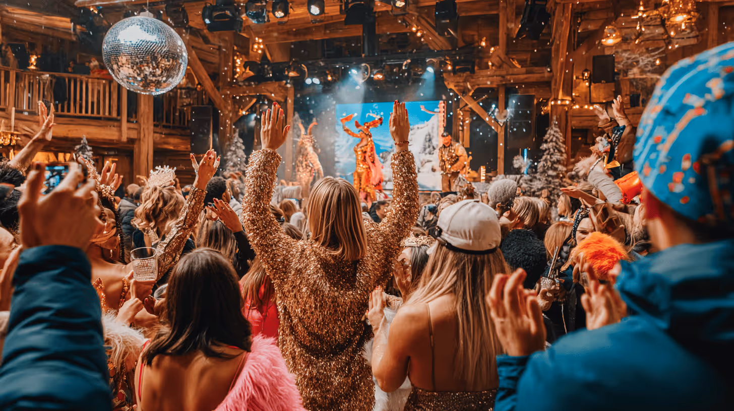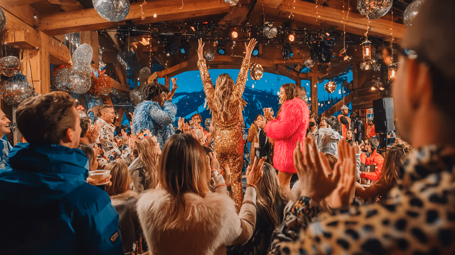Très vite, la soirée prend feu : cabaret déjanté, champagne qui jaillit, confettis dorés dans l’air glacé. Un univers où la fête se vit sans retenue, entre luxe et exubérance.
